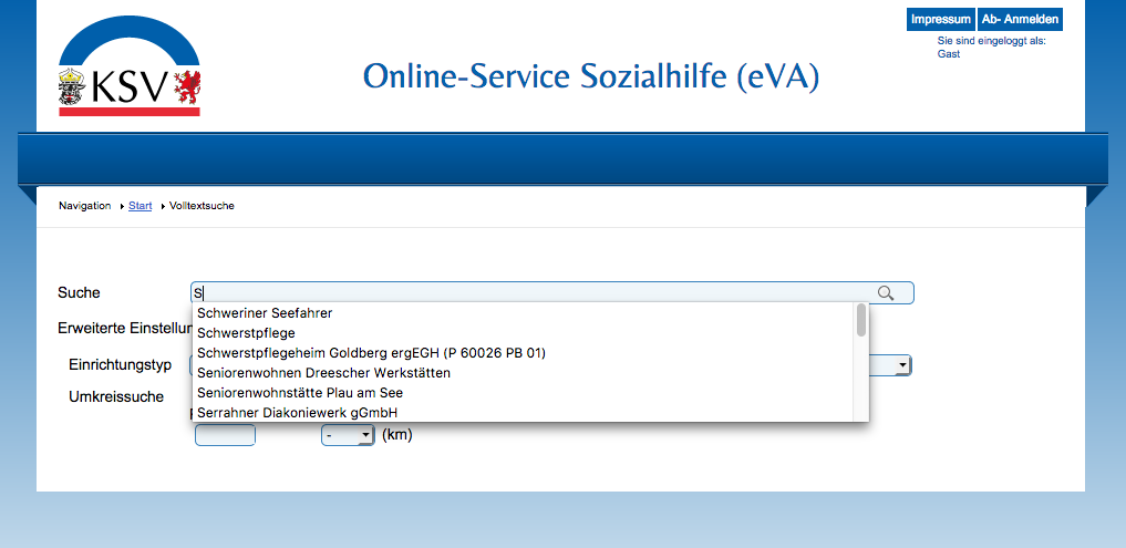 Geben Sie den Namen oder Teile des Namens der Einrichtung oder des Trägers in das Feld Suchbegriff ein. Die eingebaute Funktion der Autovervollständigung erleichtert Ihnen die Suche nach Einrichtungen.