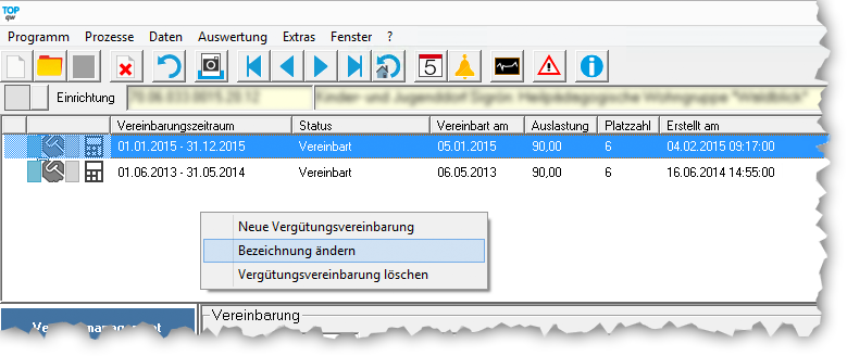 Hierzu klicken Sie mit der rechten Maustaste auf den Punkt „Vergütungsvereinbarungen“ oder „Leistungsvereinbarungen“ im oberen linken Fenster und es öffnet sich ein Kontextmenü, mit dem Sie eine neue Vereinbarung erstellen oder eine bestehende Vereinbarung löschen können.