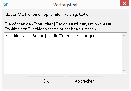 Tippen Sie im Dialog Ihren Text ein, der im Worddokument ausgegeben werden soll. Über den Platzhalter $Betrag$ können Sie den Zuschlagsbetrag ausgeben lassen.