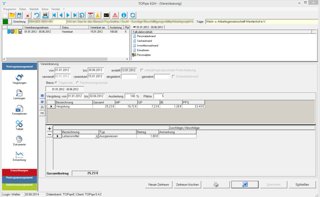 Mit der Einstellung „Zuschlag.EingabeImmerErlauben“ unter Extras → Administration → Einstellungen kann festgelegt werden, dass auch bei einem abgeschlossenen Vertrag die Zuschläge bearbeitet werden können.
