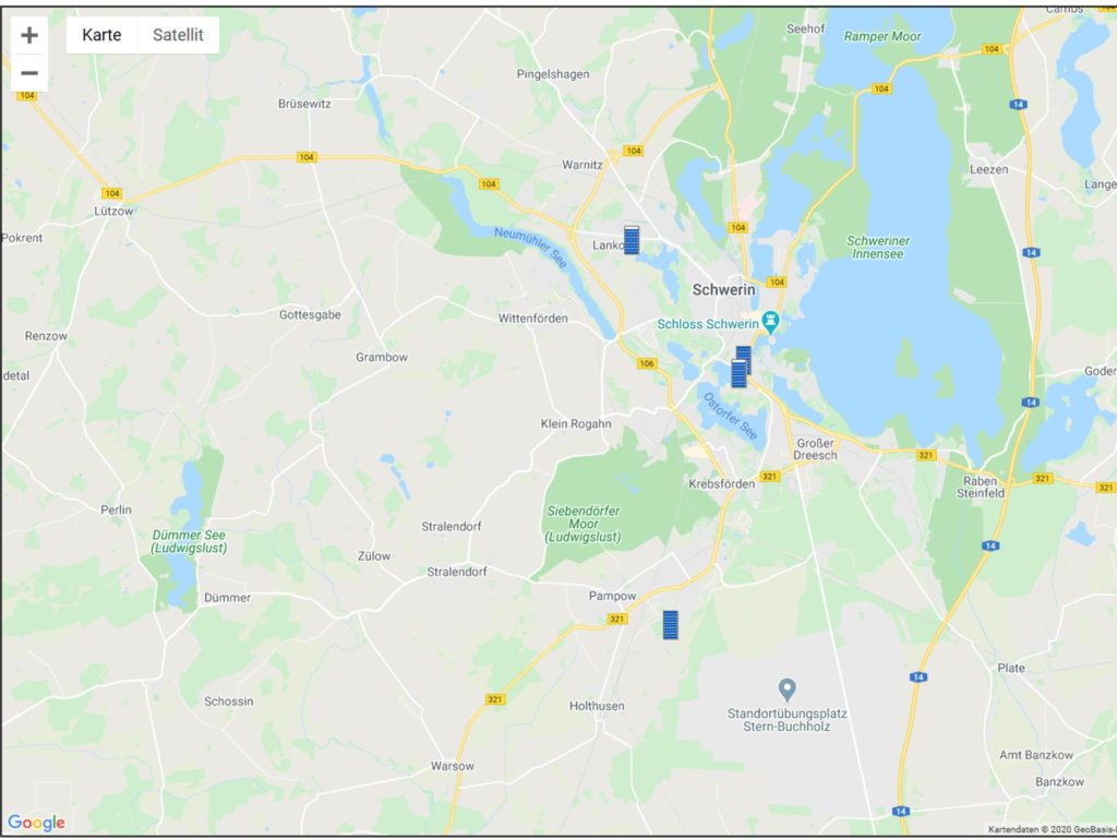 Diese Einrichtungen lassen sich auf Google Maps anzeigen. Dabei ist es auch möglich, durch die Markierung einer Spalte z.B. Gesamtvergütung, die Anzeigeart auf der Karte anzupassen.