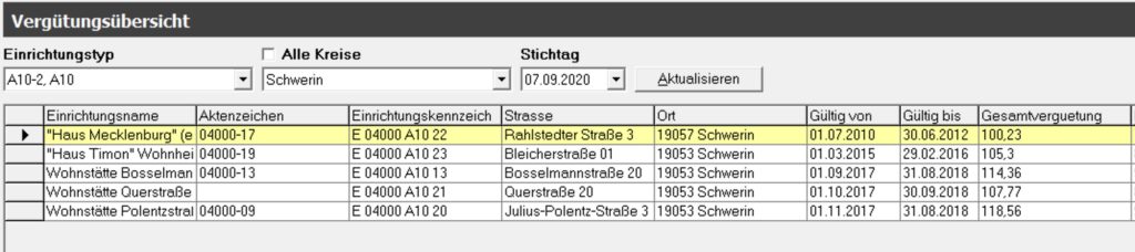Die Vergütungsübersicht ist ein nach Leistungstypen und Kreisen sortierte Ausgabe der nach dem ausgewählten Stichtag gültigen Liste der abgeschlossenen Vereinbarungen.