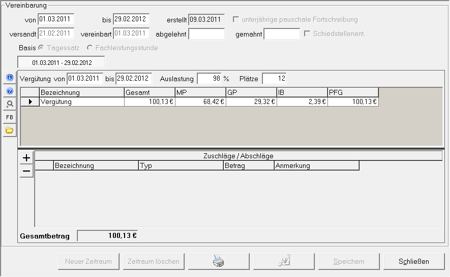 In der Vereinbarung wird Ihnen neben dem Vereinbarungszeitraum, die Auslastung und die für diesen Zeitraum genehmigte Platzzahl, die Beträge und die Zuschläge angezeigt.