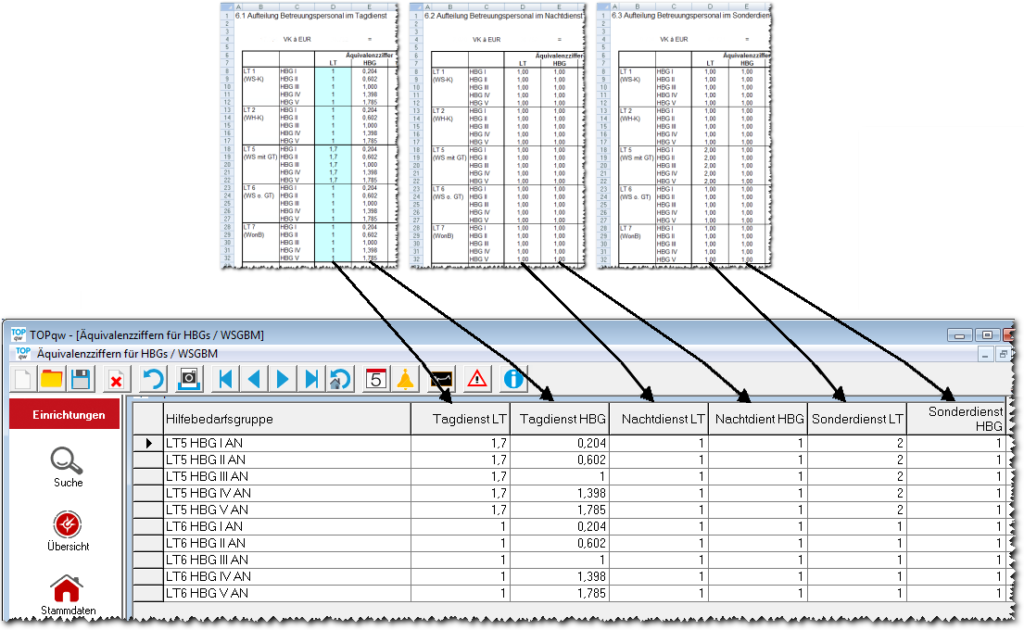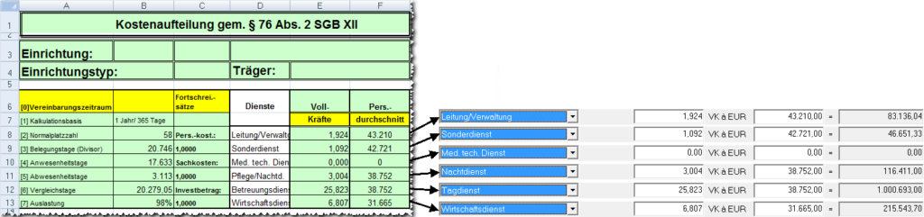 Diese sind unter Vertragsmanagement → Äquivalenz-Rg. für jeden Bereich anzugeben.Diese Daten müssen aus dem Kostenblatt für den gewünschten Zeitraum aus der Kalkulationsdatei übernommen werden.