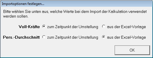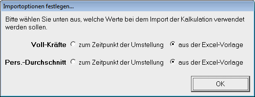 Hier kann in bestimmten Fällen angegeben werden, dass alle Daten aus dem Arbeitsblatt übernommen werden sollen. Standard ist jedoch, dass die „Voll-Kräfte“ aus den unter dem Punkt 4 angegebenen Werten verwendet werden und der „Pers.-Durchschnitt“ aus dem Arbeitsblatt importiert wird.