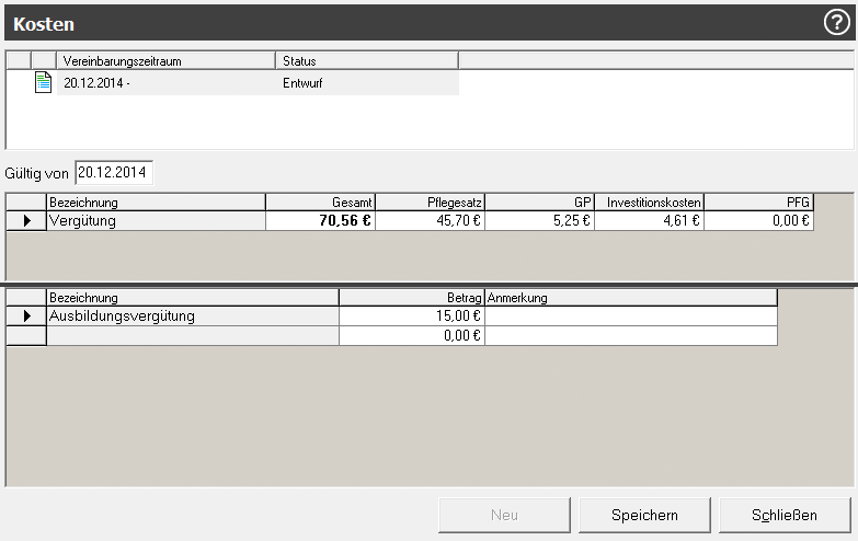 Sollte der Button Neu deaktiviert sein, gehört die ausgewählte Einrichtung einem Einrichtungstyp an, bei dem die SGB-Zuordnung nicht auf dem Wert „SGB XI“ steht. Hier werden die aktuellen Vergütungsvereinbarungen vom entsprechenden Referat hinterlegt.