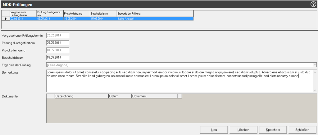 Prüfungen des medizinischen Dienst der Krankenkassen können, sofern die Information vorliegt, hier dokumentiert und später auch ausgewertet werden.