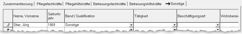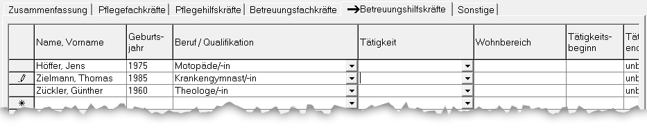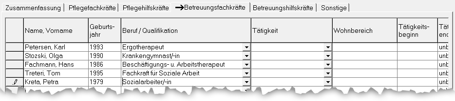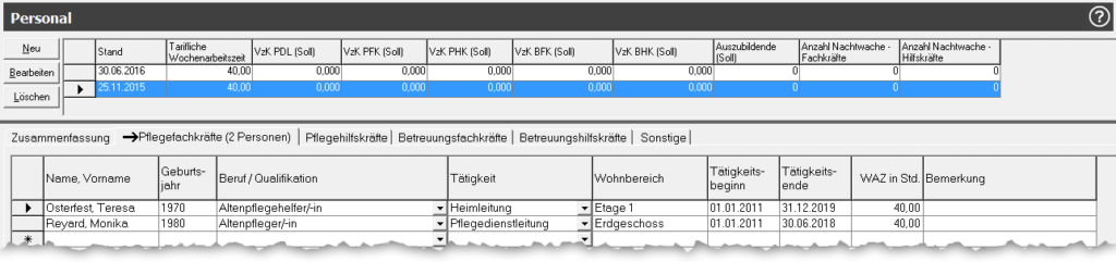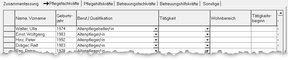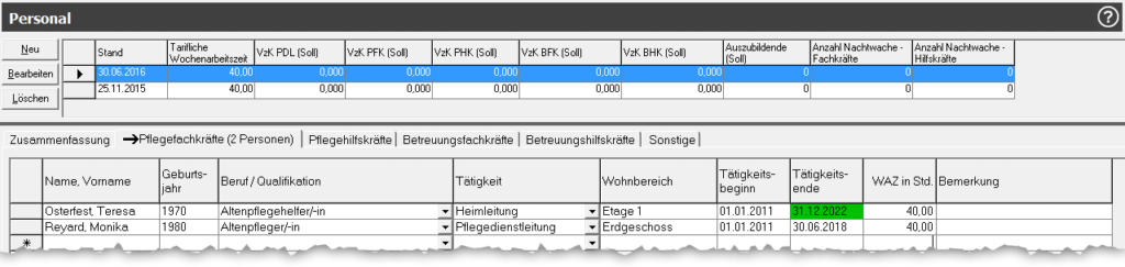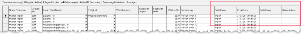 In den Reitern Pflegefachkräfte, Pflegehilfskräfte, Betreuungsfachkräfte, Betreuungsfachkräfte und Sonstige können die Spalten „Erstellt am“, „Erstellt von“, „Geändert am“ und „Geändert von“ angezeigt werden.