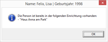 Wenn ein Name inkl. Geburtsjahr innerhalb von des Personal (gesamte TOPqw Datenbank) bei Eingabe schon existiert, wird dies durch ein Dialogfenster angezeigt. Es wird auch angezeigt in welcher Einrichtung die Person arbeitet.