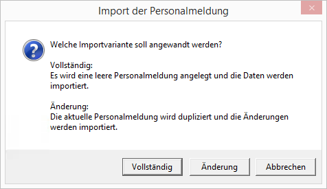 Über den Button Daten importieren können Sie die Vorlage importieren. Sie haben jetzt die Wahl einen kompletten Import zu starten oder die aktuelle Personalmeldung zu ergänzen. Bei der Ergänzung wird vorher eine Kopie des Original angelegt.